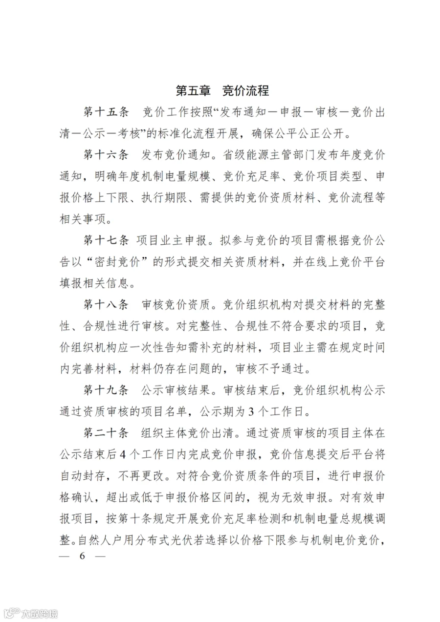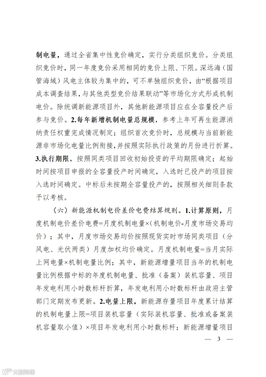 机制电价:通过全省集中性竞价确定,实行分类组织竞价。分类组织竞价时,同一年度竞价采用相同的竞价上限、下限。深远海(国管海域)风电主体较为集中的,可不单独组织竞价,由“根据项目成本调查结果,与其他类型竞价结果联动”等市场化方式形成机制电价。除统调新能源项目外,其他新能源项目应在全容量投产后参与竞价。