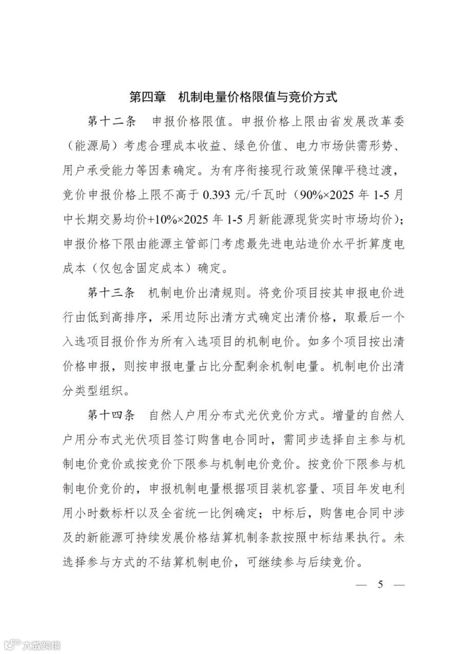 竞价上下限:竞价申报价格上限不高于0.393元/千瓦时(90%×2025年1-5月中长期交易均价+10%×2025年1-5月新能源现货实时市场均价);申报价格下限由能源主管部门考虑最先进电站造价水平折算度电成本(仅包含固定成本)确定。