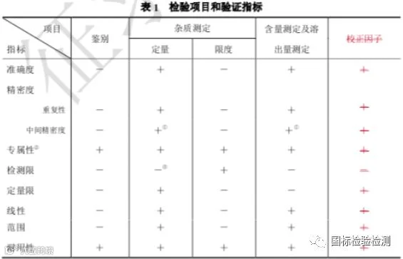 验证的指标有:专属性、准确度、精密度(包括重复性、中间精密度和重现性)、检测限、定量限、线性、范围和耐用性。在分析方法验证中,须用标准物质进行试验。 由于分析方法具有各自的特点,并随分析对象而变化,因此需要视具体情况拟订验证的指 标。表 1 中列出的分析项目和相应的验证指标可供参考。