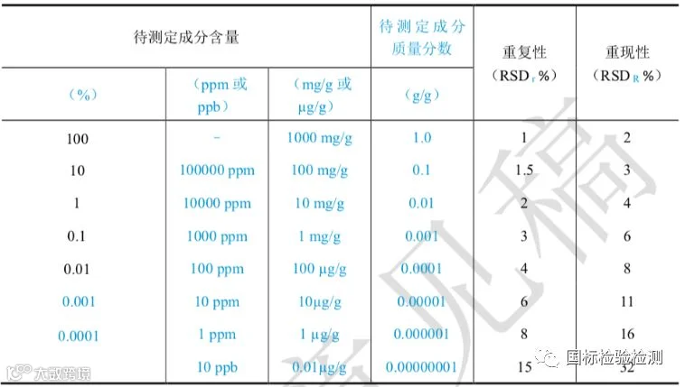 均应报告偏差、标准偏差、相对标准偏差或置信区间。样品中待测定成分含量和精密 度 RSD 可接受范围参考表 3,可接受范围可在给出数值 0.5~2 倍区间。在基质复杂、组分 含量低于 0.01%及多成分等分析中,精密度限度可适当放宽。