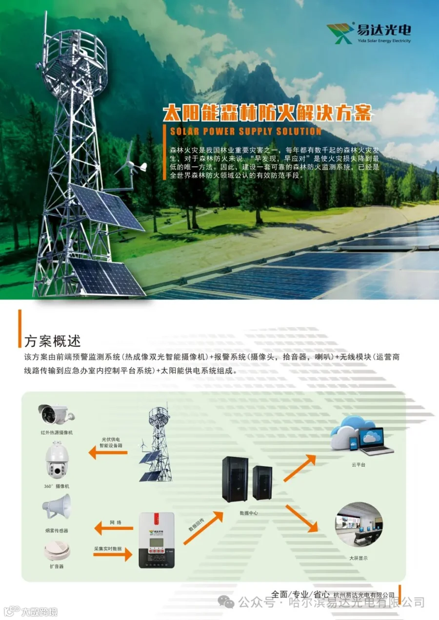 易达光电有限公司专注于风光互补太阳能供电系统20年,全国20个省级运营中心,致力于为不同领域的需求量身定制离网供电方案,为用户解决供电难难题。系统高度集成化,安装简易化,系统可变化,远程可视化,集低能耗免维护的优点,广泛应用于各种领域,包括森林防火预警监测系统,水文水利在线监测系统,平安城市智慧交通系统,海防边防在线监控系统,输电线路防外破在线视频监测系统,大气环境监测,应急预警监测,智慧农业牧业,海上牧场等等,大大降低铺设电缆的成本,并达到稳定供电的效果。