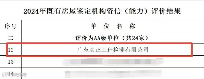 近日,广东省建设工程质量安全检测和鉴定协会对“2024年既有房屋鉴定机构资信(能力)评价”结果进行公示,广东真正获评AA级单位。