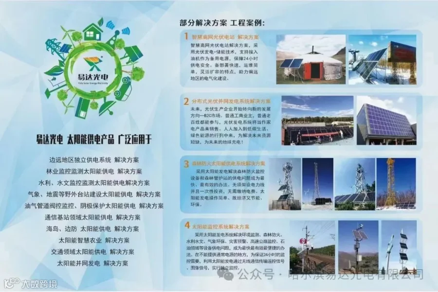 杭州易达光电有限公司专注太阳能光伏发电20多年,厂家直销太阳能发电设备,批发太阳能板,胶体电池,控制器,逆变器,光伏支架,太阳能路灯ups蓄电池,在全国东北辽吉黑西北新疆内蒙大区建立了本地化仓储运营,整体构建一站解决方案设计,快速交接。