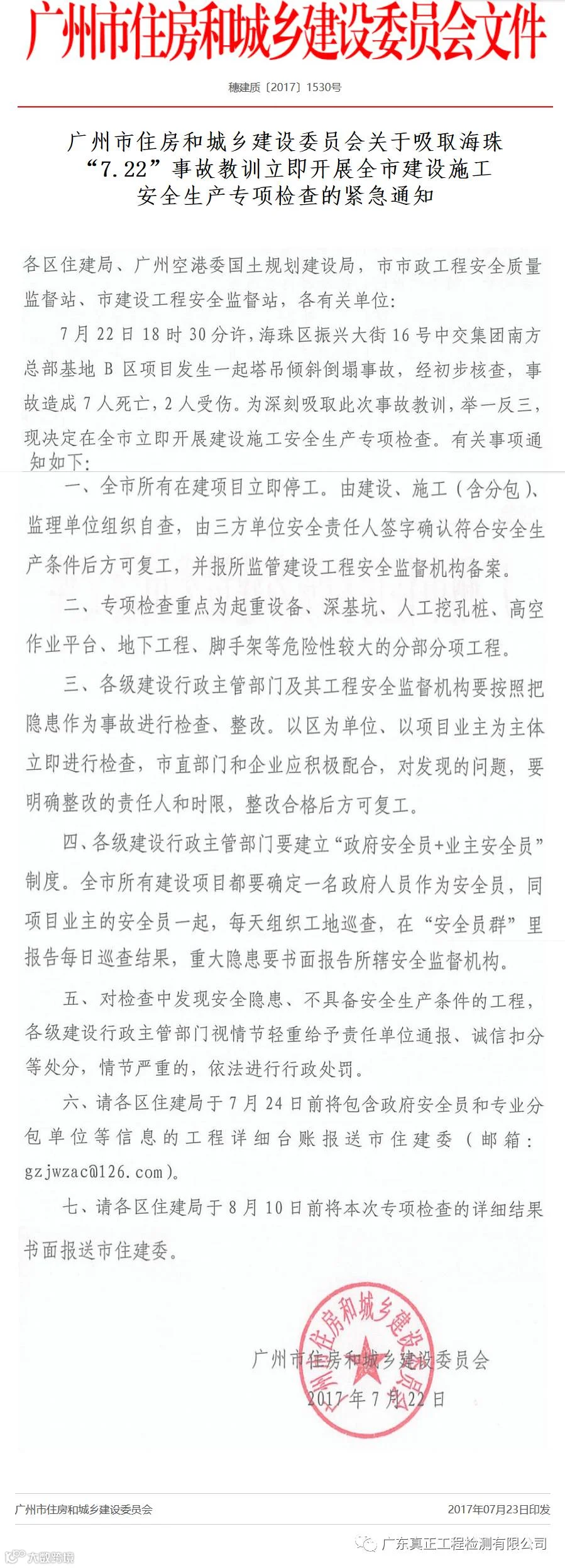 【社会热点】广州市住房和城乡建设委员会关于吸取海珠“7.22”事故教训立即开展全市建设施工安全生产专项检查的紧急通知