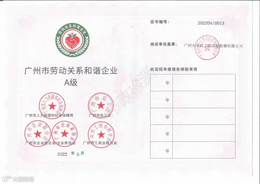 近日,广州市市政工程试验检测有限公司(以下简称“市政检测公司”)荣获由广州市人力资源和社会保障局、广州市总工会、广州市企业联合会/企业家协会、广州市工商业联合会联合颁发的“广州市劳动关系和谐A级企业”称号。