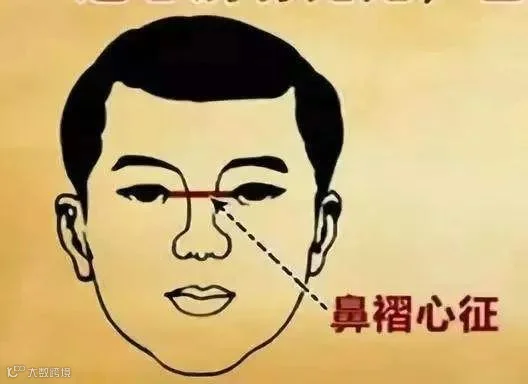 很多人在鼻梁根部,也就是两眼的中间,会有一根横纹,还有的会出现一条青筋,称为鼻褶心证。小孩子有这个,可能是一些内寒或者是肠胃淤滞,但如果成人出现这个现象,一般多是心脏的问题。