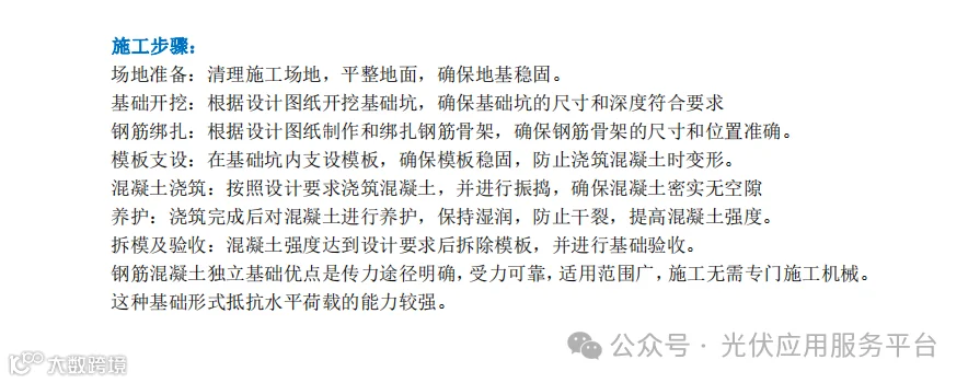 施工步骤:场地准备,地基处理,水泥块制作,安装光伏支架。这种方式通常应用在小型和中型光伏电站,临时性光伏系统,特殊地质的场合。