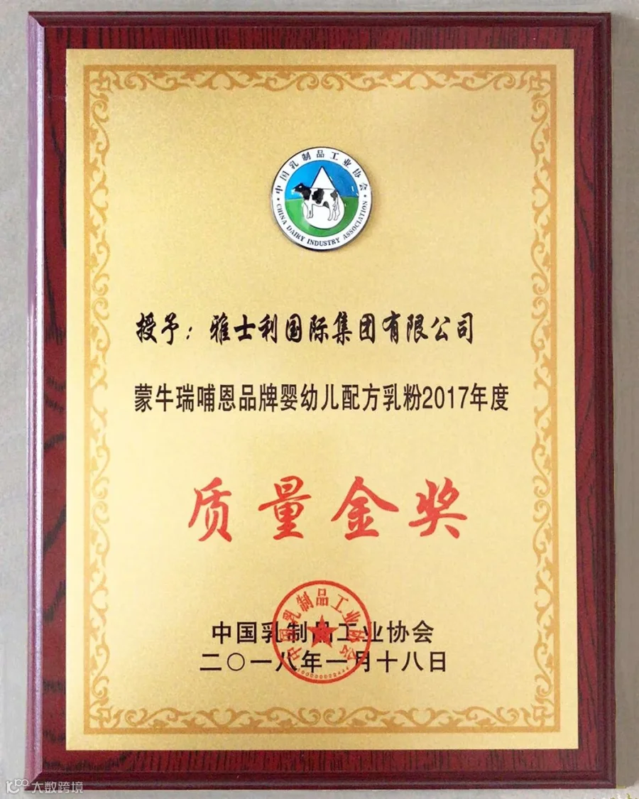 在活动的颁奖环节,雅士利国际集团有限公司凭借多年来对品质坚守的实力,在这场年度“质量大赛”中获得荣誉和表彰,被中国乳制品工业协会授予“雅士利品牌婴幼儿配方乳粉2017年度质量金奖”以及“蒙牛瑞哺恩品牌婴幼儿配方乳粉2017年度质量金奖”!