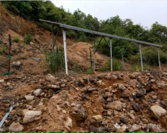 光伏组件区域地表裸露,边坡未做防护,易受水流冲刷,导致土体流失,暴雨季节极易发生边坡垮塌事故,进而造成桩基倾斜、沉降,组件变形损坏。
