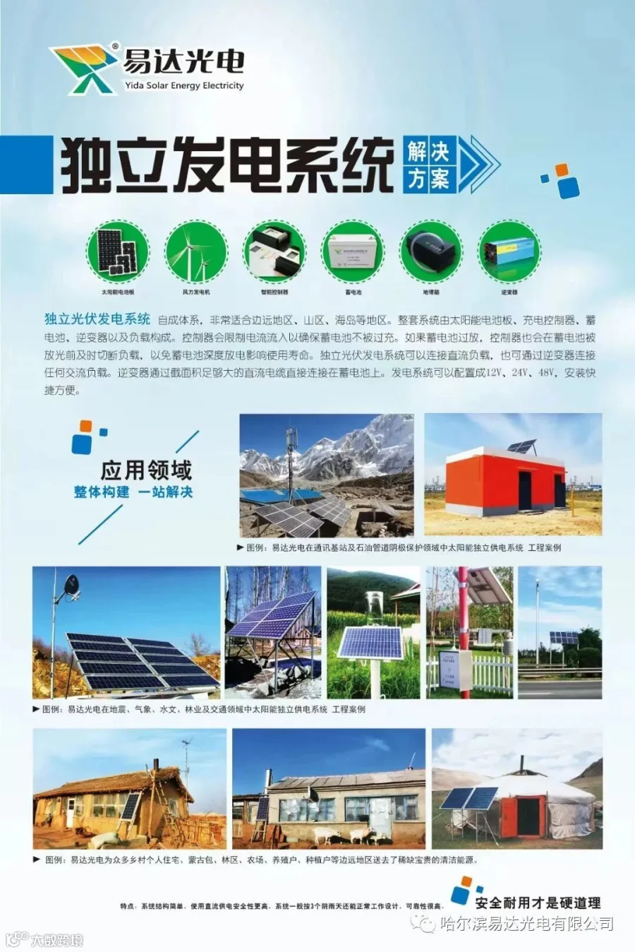 哈尔滨易达光电有限公司 杭州易达光电有限公司专注太阳能光伏发电20多年,厂家直销太阳能发电设备,批发太阳能板,胶体电池,控制器,逆变器,光伏支架,太阳能路灯ups蓄电池,在全国东北辽吉黑西北新疆内蒙大区建立了本地化仓储运营,整体构建一站解决方案设计,快速交接。