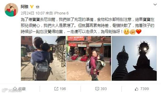 前不久,阿雅还晒出了她带女儿去尼泊尔出游的照片,照片中阿雅抱着女儿走在尼泊尔的街道上,脸上洋溢着幸福的笑容,女儿则安心趴在阿雅的肩膀上睡去。一路抱着女儿的阿雅非但不嫌弃重,反倒是一副幸福的模样,她说:“抱着孩子的时候却一点也没觉得她重,一走还可以走很久,为母则强呀!”