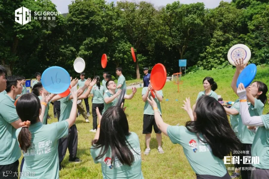 飞盘飞扬,凝聚力量。训练营首次户外团建活动,在黄埔红岭头红茶创意园举办,在活动现场,有趣的飞盘九宫格、飞盘投篮、飞盘高尔夫、飞盘保龄球等项目,让学员们在轻松愉快的氛围中体验了户外运动的快乐,学习飞盘运动的意义,学会控制飞盘力度,更精准出击,让团队默契与信任在游戏的过程中不断增进,也在不同竞技中提升团队意识和个人体能,紧密合作,互相鼓励。通过别开生面的户外飞盘活动,学员们更能体会科城铁军“敢担当、善作为,能力强、能吃苦,会算账、会打仗”的团队精神,将全力为科学城集团高质量发展拼搏。