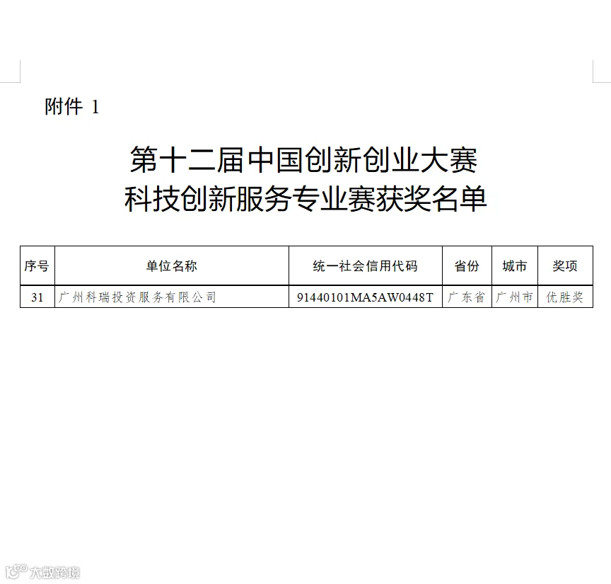 我司从全国参赛的400多家科技服务机构中脱颖而出,排名全国前31位,荣获优胜奖,并纳入广州市科学技术局的“科技服务机构白名单”。