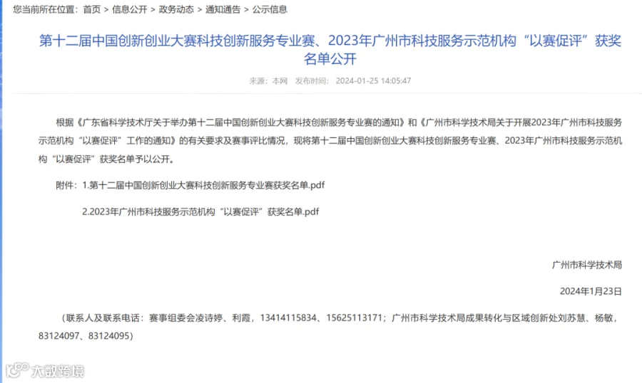 近日,由广东省科学技术厅指导,广州市科学技术局主办的第十二届中国创新创业大赛科技创新服务专业赛、2023年广州市科技服务示范机构“以赛促评”获奖名单公示。