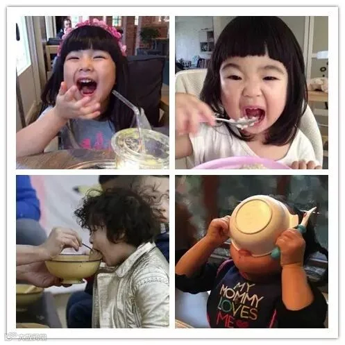 饭点一到,首先第一个冲出起跑线的是邓超闺女小花妹妹,只见她左手拿勺右手拿碗,还没等老爸嘴巴合起来,已经把整个碗贴在脸上,嘴角还留着酱汁儿。