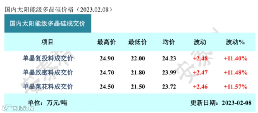 根据公示信息,本周国内单晶复投料价格区间,在22.0-24.9万元/吨,成交均价为24.23万元/吨,周环比涨幅为11.40%;单晶致密料价格区间在21.8-24.7万元/吨,成交均价为23.99万元/吨,周环比涨幅为11.48%。