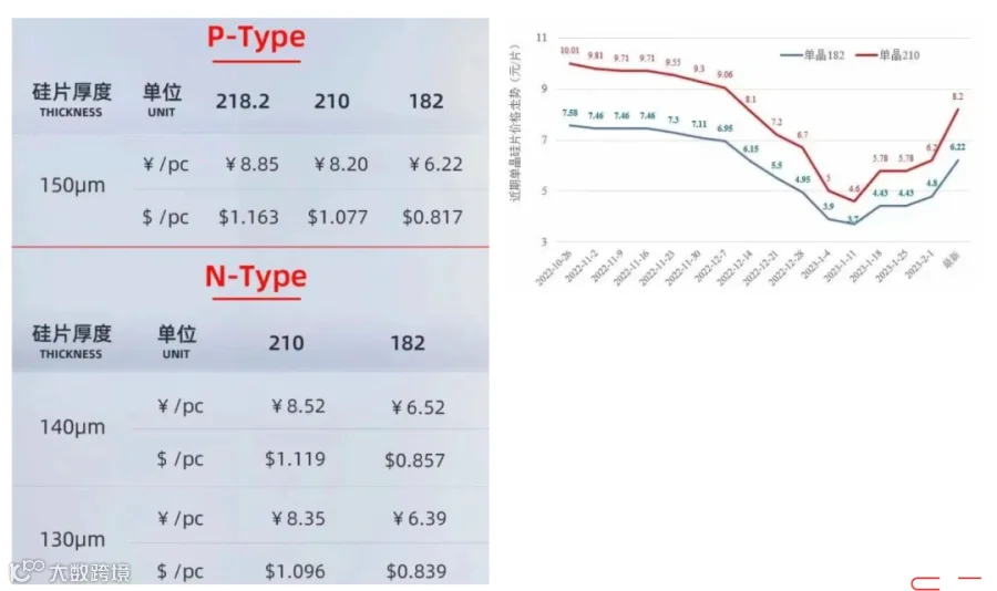 2月4日,TCL中环宣布硅片价格更新,各尺寸硅片售价直线上涨。其中,150μm厚度P型210、182硅片报价分别为8.2元/片、6.22元/片,较12月23日报价分别上调1.1元、0.82元。