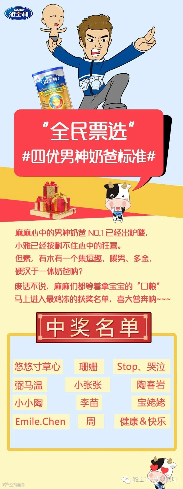 万众期待的#全民票选四优男神奶爸标准#新鲜出炉呐~第一名就素人气杠杠的逗趣奶爸,当然呐,暖男奶爸、多金奶爸和硬汉奶爸也俘获了不少麻麻的芳心!看到麻麻们投票辣么认真,小雅继续任性,送礼送礼!看看自己有木有被幸运砸中呢?