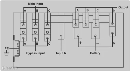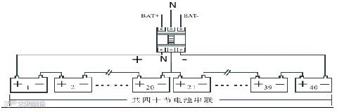 电池组由电池的+,-和N线三根线引出与UPS系统相连,其中电池N 线是从正负电池组中间连接点引出的参考电位,具体接线如下图1‑9所示。
