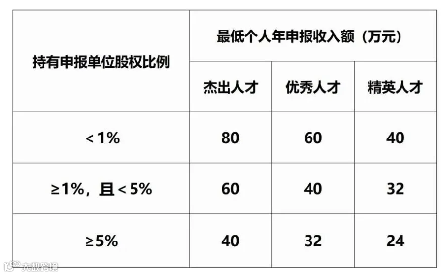5.持有申报单位股权比例<1%的,在申报单位的个人年申报收入额不少于40万元;持有申报单位股权比例≥1%,且<5%的,在申报单位的个人年申报收入额不少于32万元;持有申报单位股权比例≥5%的,在申报单位的个人年申报收入额不少于24万元。