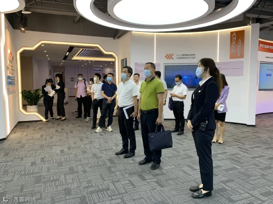 2021年9月29日下午,黄埔区人力资源社会保障局副局长刘小斌、人力资源策划总监谢成、就业促进处四级调研员綦宗彬 、专业技术人员管理处处长杨懿等一行莅临中新广州知识城国际人才自由港参观、交流和座谈。中新广州知识城开发建设办科技和知识产权处处长徐博、广州科瑞投资服务有限公司董事长谭小洁、广东省博士博士后人才发展促进会秘书长郑厚明等接待。