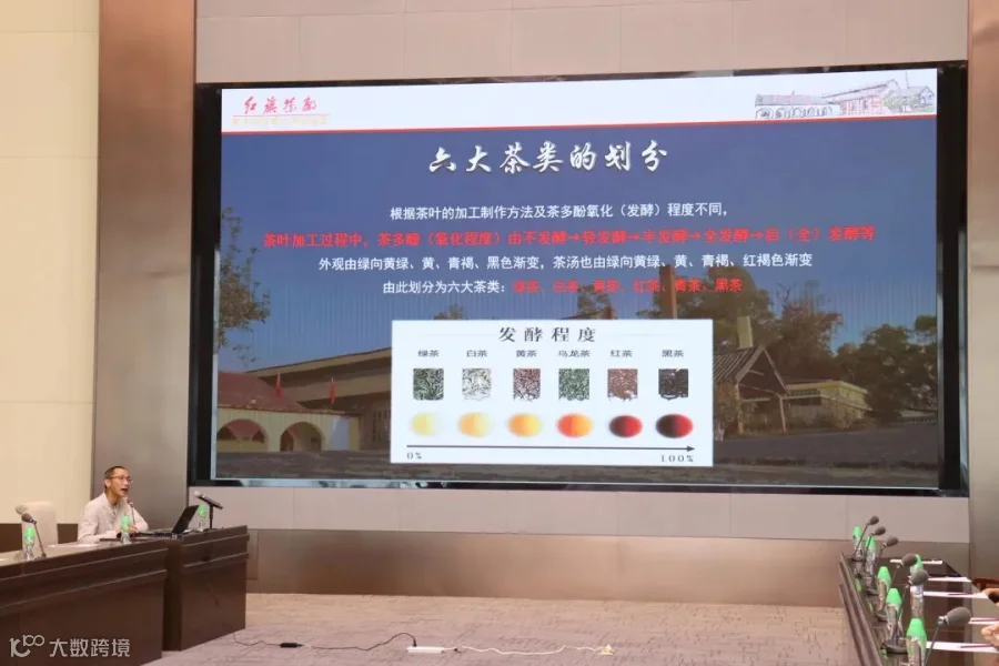 上午,参加人员前往知识城国际合作交流中心一楼会议厅听红旗茶厂副总经理丘典分享红旗茶厂一路发展至今的精彩故事。副总经理丘典将红旗茶厂的发展与中国现代历史及现代工业的发展历程相结合,与党史党建相结合,讲述上世纪五、六十年代,在朱德、陶铸等老一辈革命家的关注下,红旗茶厂应势而生,自建厂以来,红旗茶厂就书写着老一辈红旗人的奋发图强、自主创新的制茶精神——发明制茶设备、发明全国红碎茶二套标准样、统一英德红茶的生产水平。曾经过往的历史铸就了一个辉煌的名字“红旗茶厂——中国英德红茶的摇篮”。红旗茶厂生产的红茶先后在国际国内茶叶评比中获得36个殊荣,为全国茶企之最。随后,副总经理丘典从茶的起源、六大茶类的划分及茶艺礼仪服务三个方面为大家介绍茶文化知识。
