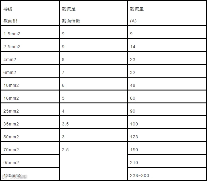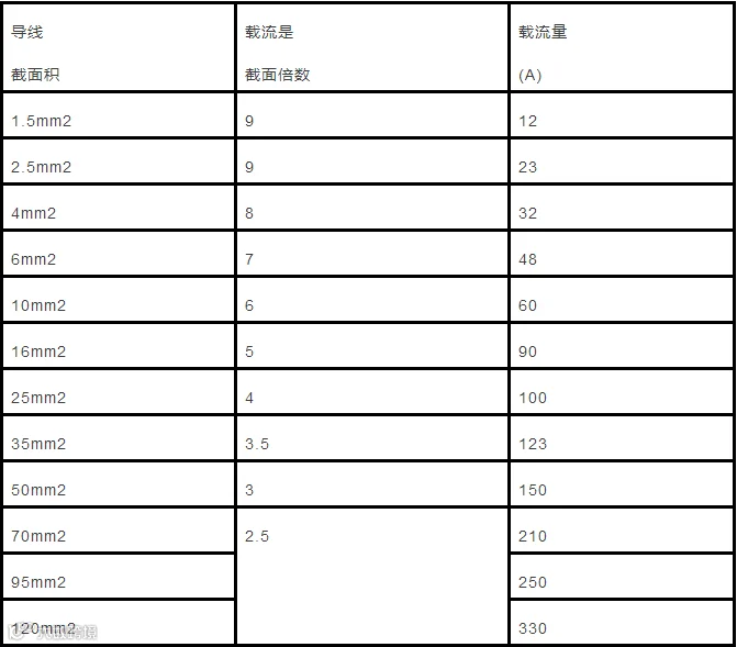 严格要求就用导线截面积乘以4作为载流量。载流量小,导线就要得多,成本就高。为了降低成本,又保证安全,很多家装在不是封闭布线时就采用导线截面积乘以5倍或者6倍来提高导线的载流量。