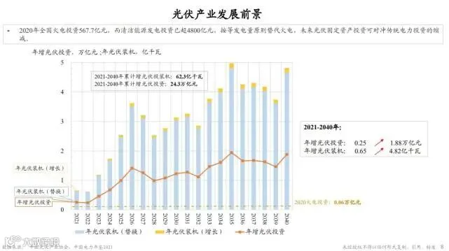 按照刚才的演进路径,光伏产业投资假如从2021年开始,新增的电源都是由光伏装机来实现,那么下面这张图就展示了未来的20年的一个投资逐渐增加的过程,从开始大概0.25万亿,到后来大概2万亿的年投资,整个全过程完成约20年,总共的投资规模大概是20多万亿元。