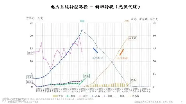 这就是一个转型路径的问题。在这里我们有一个策略,这些煤电既然已经建了,那么就让它在工作寿命期持续工作,随着时间推延,每年会有折旧的、退役下来的,那在新增的发电能力上,就不再做传统电源的投资,而是把新的投资都集中在光伏类型的新能源,这样就会每年有一个逐渐等量替换的概念。同时如果有新的经济增长需求,光伏的投资根据实际情况也可以略微增加,这样的话就可以用大概20年完成一个自然的能源转型,最终实现用光伏来替代煤炭,实现我们的“双碳”目标。