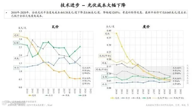 再看新优势,就是技术进步使得光伏成本大幅下降。在过去的十年,光伏的度电价格降幅超过85%。左图中每瓦的光伏装机的价格有一个很大的降幅,然后看右图中光伏每度电的价格也有了大幅度下降,这也是在几种不同的可再生能源类别中成本降幅最快的,这样的话就大大提升了光伏的经济可行性。