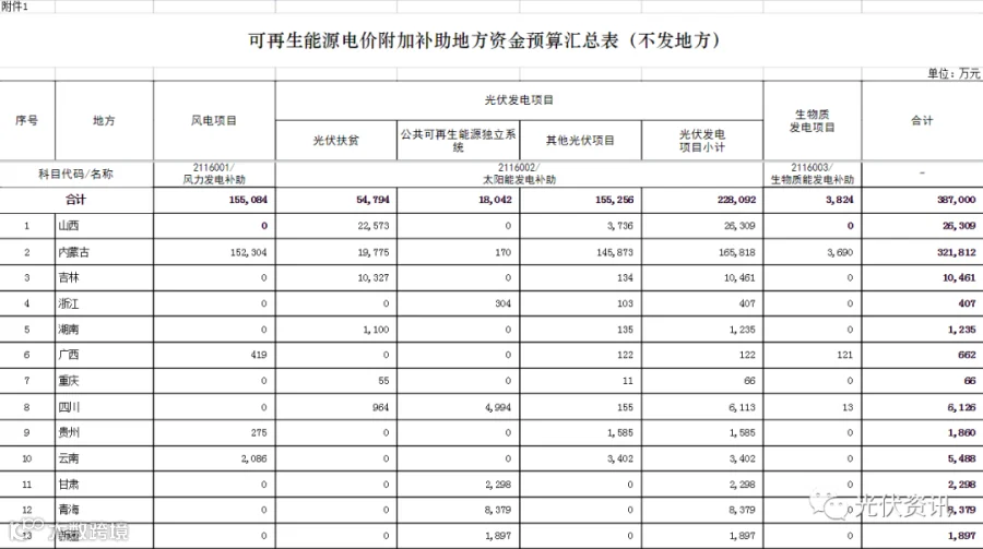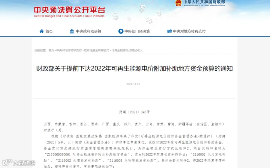 11 月 16日,中央预算公共平台发布“关于提前下达2022年可再生能源电价附加补助地方资金预算的通知”。根据通知,本次下达总计
