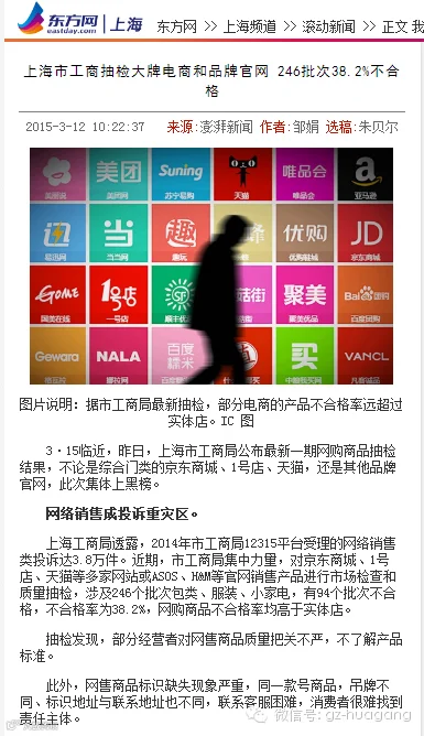上海工商局透露,2014年市工商局12315平台受理的网络销售类投诉达3.8万件。近期,市工商局集中力量,对京东商城、1号店、天猫等多家网站或ASOS、H&M等官网销售产品进行市场检查和质量抽检,涉及246个批次包类、服装、小家电,有94个批次不合格,不合格率为38.2%,网购商品不合格率均高于实体店。抽检发现,部分经营者对网售商品质量把关不严,不了解产品标准。此外,网售商品标识缺失现象严重,同一款号商品,吊牌不同、标识地址与联系地址也不同,联系客服困难,消费者很难找到责任主体。