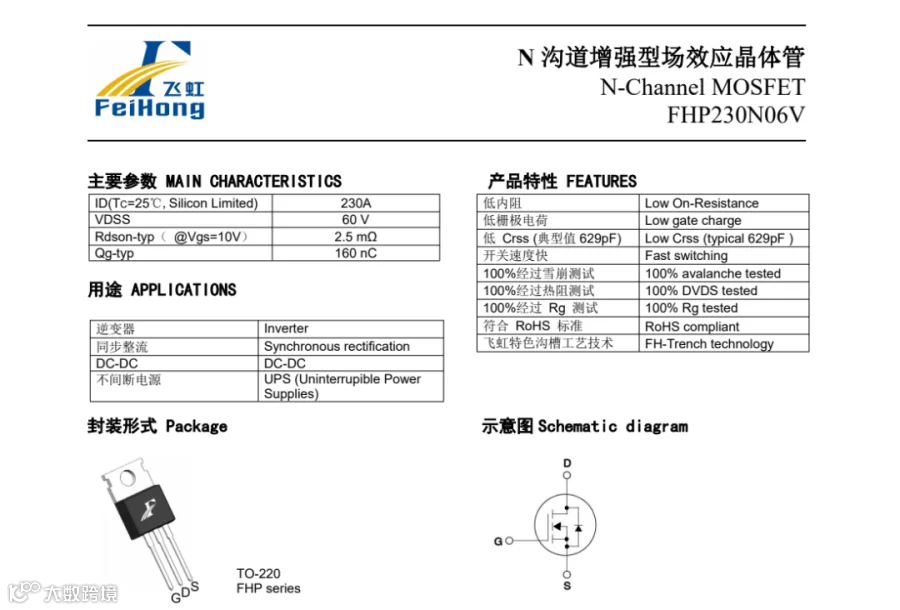 而从FHP230N06V场效应管产品具体参数看:Vgs(±V):20;VTH(V):3;ID(A):230;BVdss(V):60。RDS (on) = 2.5mΩ(typ)@V GS =10V、RDS (on) = 3.0mΩ(max)@V GS =10V。