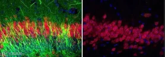 ▲左图显示新生儿海马脑区有大量的新生神经元(绿色),成熟的神经元为红色标记;右图显示成年人海马脑区内没有新生神经元,只有成熟的神经元。