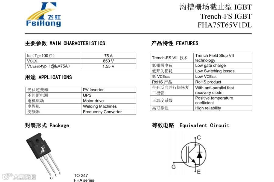 它就是FHA75T65V1DL型号IGBT单管,它具有75A、650V电流、电压参数,正满足逆变器的电路设计,而且能无缝代换IKW75N65ET7IGBT单管。