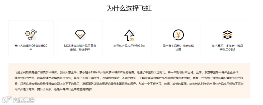 飞虹半导体作为国内大功率MOS管重点封装基地之一,扎根广州诚信经营20余年,拥有雄厚的技术实力和创新能力。飞虹产品被广泛应用于步进电机行业、电动车行业、音响、家电、LED照明等多个领域,年产能达数亿只。凭借多项国家级科技荣誉和与华南理工大学的产学研合作,飞虹产品质量卓越,是足以媲美国际水平的。