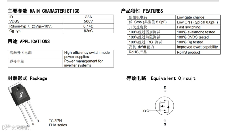 除上述符合的特点外,这一款优质FHA28N50W国产场效应管还具备的产品参数有:28A、500V的电流、电压,RDS(on) = 0.14Ω(typ) @VGS = 10 V;RDS(on) = 0.18Ω(MAX) @VGS = 10 V,最高栅源电压@VGS =±30 V。