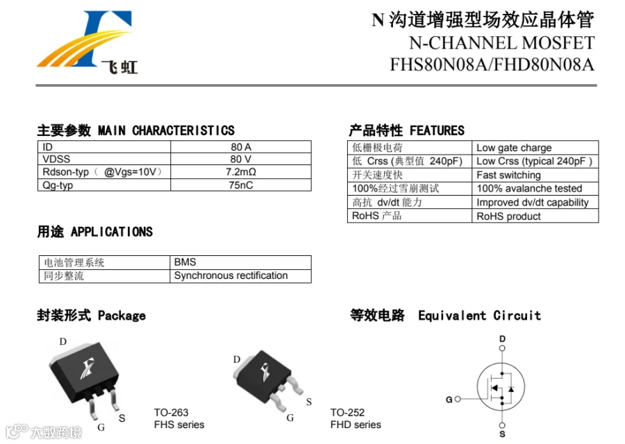 目前国产MOS管中,可替换多款场效应管产品使用的具体型号为:FHS80N07、FHS80N08、FHS100N8F6A、FHS110N8F5B、FHS170N8F3A、FHD100N03D、FHS150N03C,以上7款产品都是可以应用于锂电池保护板中的。