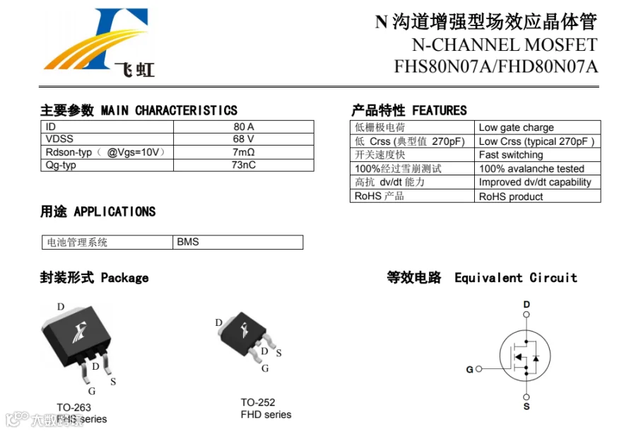 FHS80N07的封装形式是TO-263。这款产品参数:Vgs(±V):25;VTH(V):2-4;ID(A):80A;BVdss(V):70V。