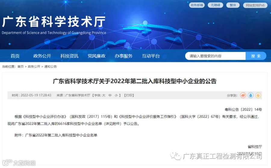 近日,广东省科学技术厅发布《广东省2022年第二批拟入库科技型中小企业》的公告,广东真正工程检测有限公司获得“科技型中小企业”认定!
