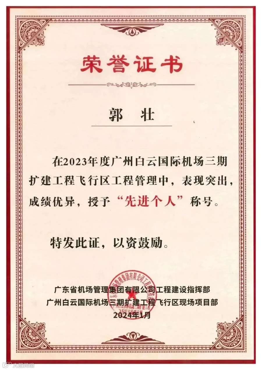 1月31日,广东省机场管理集团有限公司工程建设指挥部召开表彰大会,市政检测公司荣获“2023年度检测服务先进单位”,郭壮同志荣获“先进个人”。
