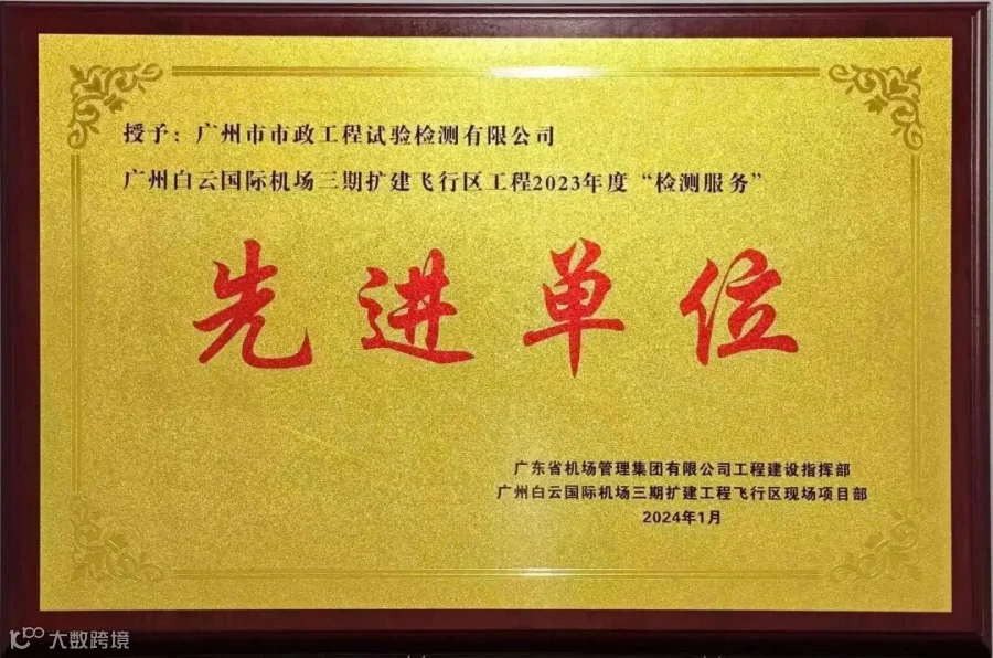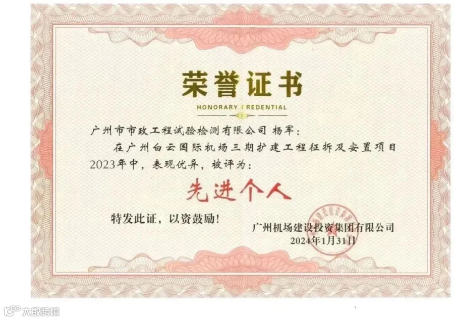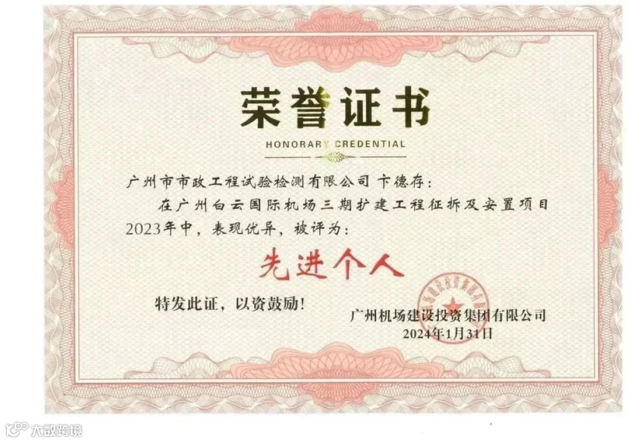 近日,市政检测荣获广州白云国际机场三期扩建工程征拆及安置项目、广州白云国际机场三期扩建飞行区工程项目“先进单位”荣誉称号,孙晓立、杨军、卞德存、郭壮等人荣获“先进个人”荣誉称号。