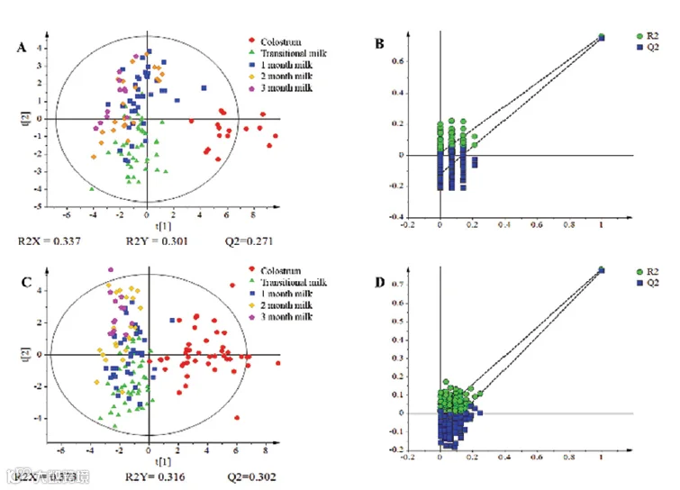 早产儿母亲母乳的总脂肪酸(A和B)和sn-2脂肪酸(C和D)的PLS-DA评分图