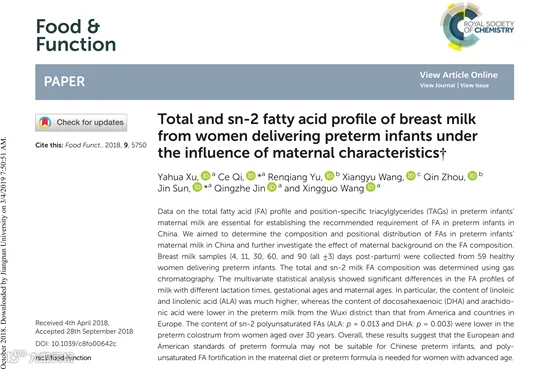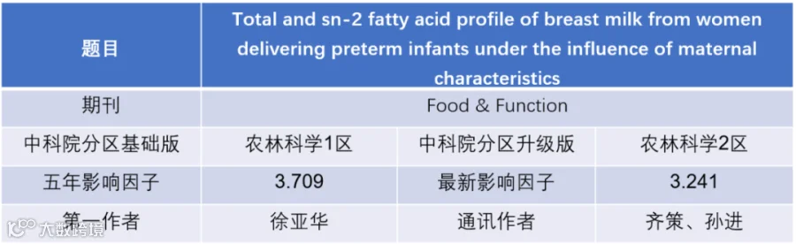 研究发现,早产儿若通过母乳喂养,有助于增加体重,同时降低坏死性小肠结肠炎的发病率。然而,当在母乳喂养条件不足时,最好的替代便是婴幼儿配方奶粉。目前早产儿配方奶粉的标准主要参考欧美标准,但由于人种和膳食的差异,无法满足中国地区早产儿的需求。为确定中国早产儿配方奶粉中的脂肪特征,需研究中国早产儿母亲母乳的脂肪组成。