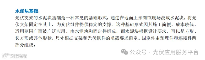 施工步骤:场地准备,地基处理,水泥块制作,安装光伏支架。这种方式通常应用在小型和中型光伏电站,临时性光伏系统,特殊地质的场合。