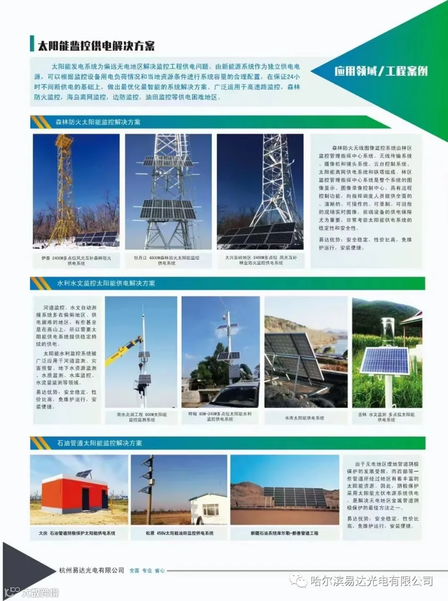 杭州易达光电有限公司专注太阳能光伏发电20多年,厂家直销太阳能发电设备,批发太阳能板,胶体电池,控制器,逆变器,光伏支架,太阳能路灯ups蓄电池,在全国东北辽吉黑西北新疆内蒙大区建立了本地化仓储运营,整体构建一站解决方案设计,快速交接。