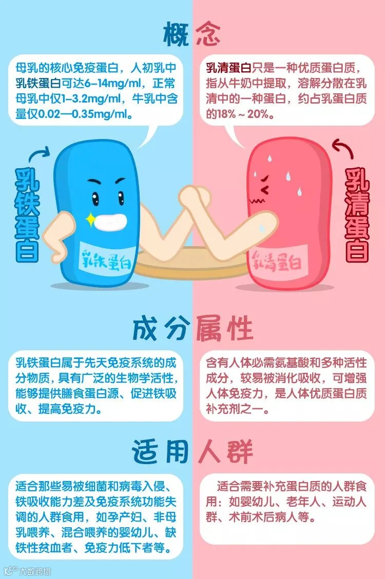 值得注意的是,目前市面上有不少打着乳铁蛋白幌子的“乳铁奶粉”。其主要成分为乳清蛋白。宝爸宝妈们一不小心可就上了当,以为这是纯正的乳铁蛋白奶粉。