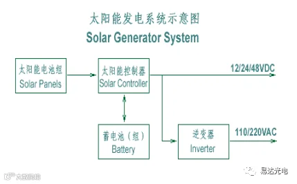 太阳能供电系统由太阳能电池组件、太阳能控制器、蓄电池(组)组成。如输出电源为交流220V或110V,还需要配置逆变器。各部分的作用为: