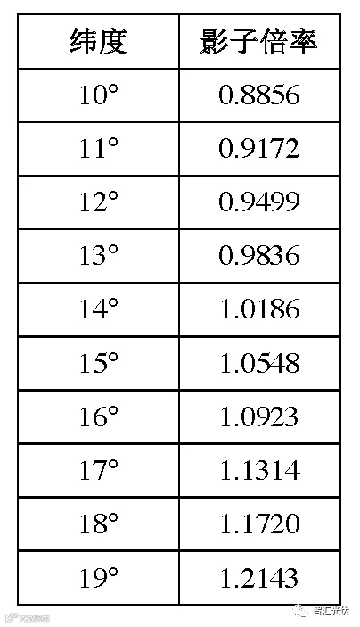 表1:项目场址所在地纬度为10°~19°时的影子倍率
