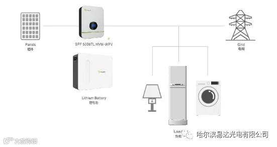 光伏方阵在有光照的情况下将太阳能转换为电能,通过一体机给负载供电,同时给蓄电池组充电,在无光照时,由蓄电池给太阳能控制逆变一体机供电,再给交流负载供电。电网停电时,切换到离网状态,通过备电模式给重要负载供电,当电网恢复时,切回到并网工作。主要适用于电网不稳定且有重要负载的,或者光伏自发自用不能余量上网、自用电价比上网电价价格贵很多等应用场所。可利用胶体蓄电池,储存光伏阵列转化的电,提高自发自用比例,也可在非高峰期给电池充电,用电高峰期使用,以减少电费开支,最重要的是当电网停电时,可以转为离网运行,作为备用电源使用。